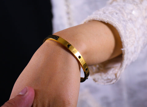 Our 22K gold-plated bangle, adorned with stunning black diamonds, is the perfect addition to elevate any jewelry collection. Available in a range of captivating colors, each bangle has its own unique features, allowing you to...