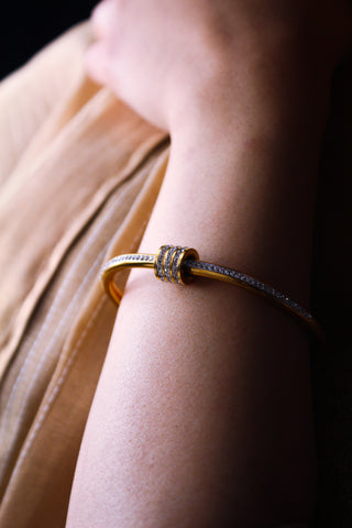 The Twist Bangle is a masterpiece of elegance and versatility. Designed with a secure, adjustable fit, it ensures both comfort and style. Available in luxurious gold-plated and silver-plated finishes, this bangle is adorned with dazzling,...