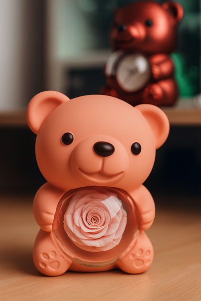 Add a touch of charm and romance to your jewelry storage with this adorable Pink BloomBear Jewelry Box. Crafted with a smooth, matte finish, the teddy bear design holds a beautifully preserved rose encased in a clear dome, creating an elegant and sentimental display piece.