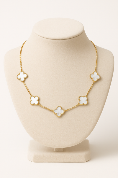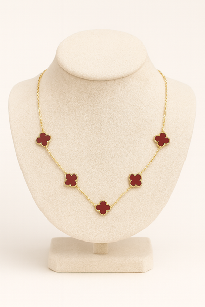Elevate your style with the Azure Clover Elegance Necklace, a delicate gold-tone chain adorned with five radiant clover-shaped charms. Each charm features smooth, vibrant enamel framed with fine gold beading, creating a luxurious contrast that stands out beautifully. Lightweight, refined, and effortlessly chic, this necklace adds a pop of color and sophistication to any outfit, perfect for both everyday wear and special occasions.
